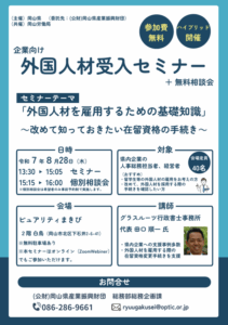 岡山県主催、岡山労働局共催による「「外国人材を雇用するための基礎知識」~改めて知っておきたい在留資格の手続き~」というタイトルのもので、リアル参加・オンライン参加含めておよそ50名程に参加いただきました。https://www.optic.or.jp/event/event_detail/index/3632.html